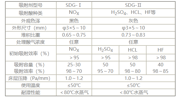 酸氣吸附效果較好的產(chǎn)品主要集中在SDG酸氣吸附劑和氧化鐵脫硫劑兩類,具體選擇根據(jù)實際處理的酸氣類型,使用場景及工藝要求綜合考慮。SDG酸氣吸附劑是當(dāng)前應(yīng)用較廣的酸性氣體凈化材料,具有吸附效率高,適用性廣,對環(huán)境友好,無二次污染和分型設(shè)計的特點。SDG酸氣吸附劑分為1型和二型,分別對硝酸霧和硫酸,鹽酸等氣體有較好的處理效果。